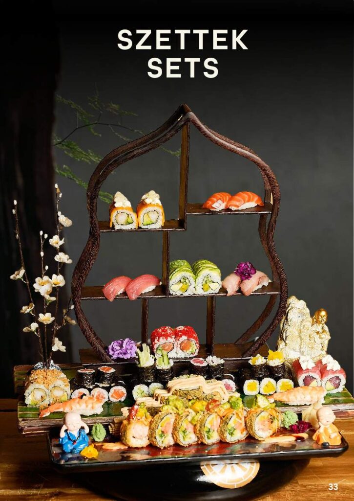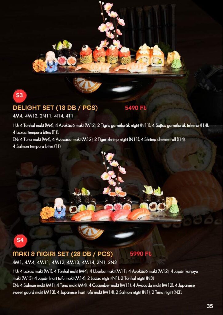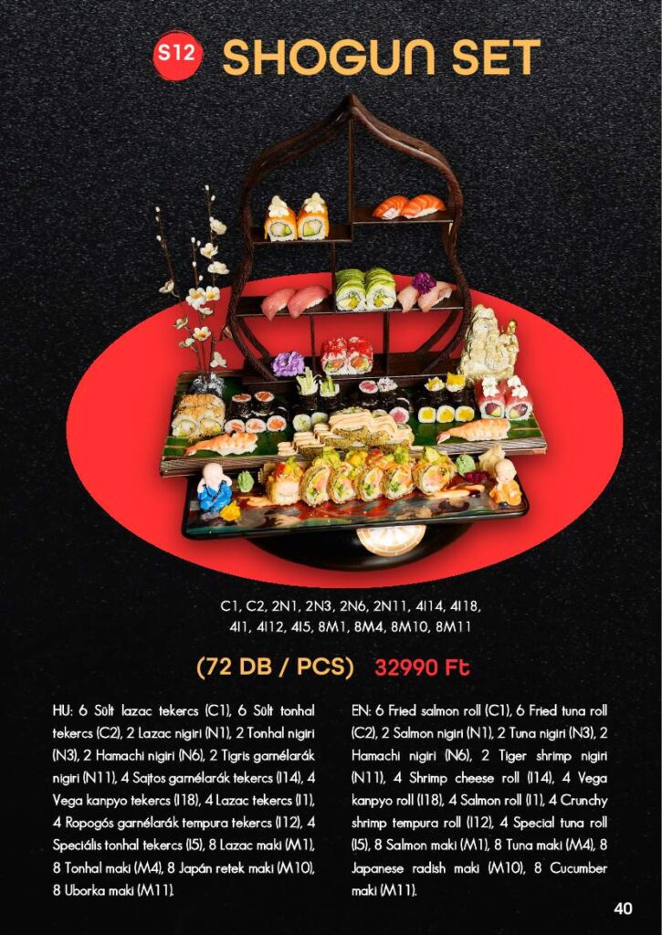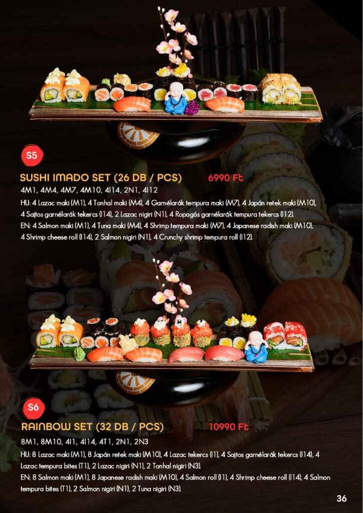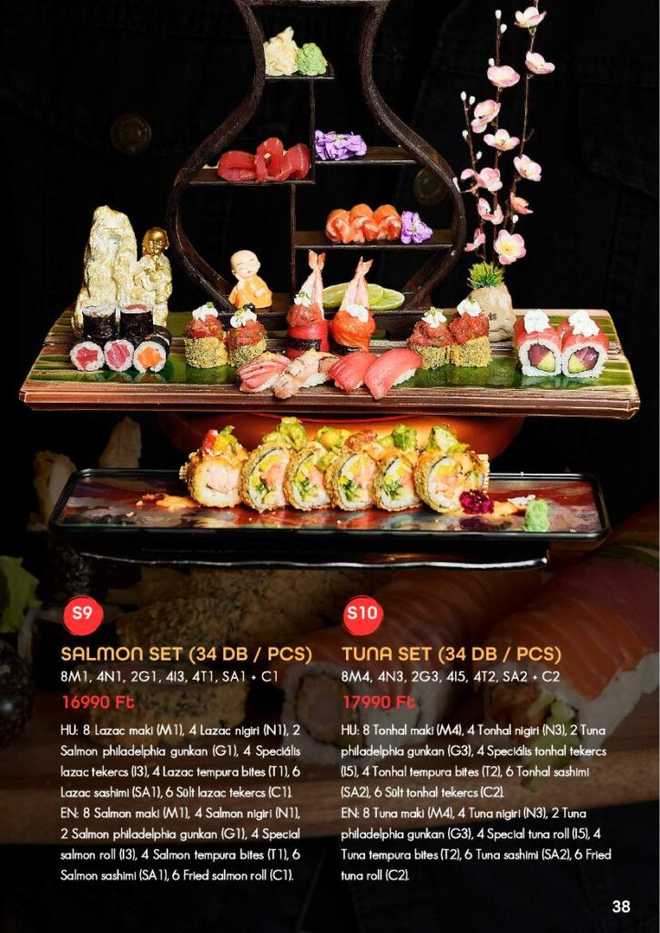 EN:8 salmon maki, 8 tuna maki, 8 shrimp tempura maki, 8 special inside out salmon roll, 8 special inside out tuna roll, 12 fried shrimp tempura roll. 8 nigiri (2 garnélarák, 2 lazac, 2 surimi, 2 tonhall. 8 nigiri (2 shrimp, 2 salmon, 2 surimi, 2 tuna)., 3 lazac és 3 tonhal sashimi, 3 salmon & 3 tuna sashimi.