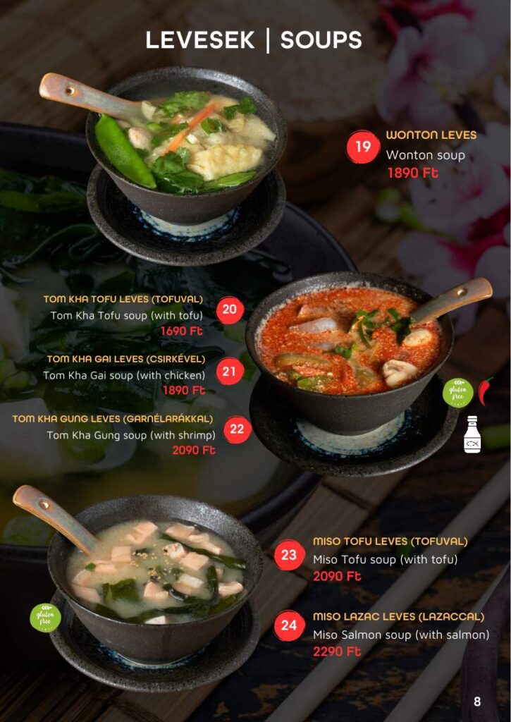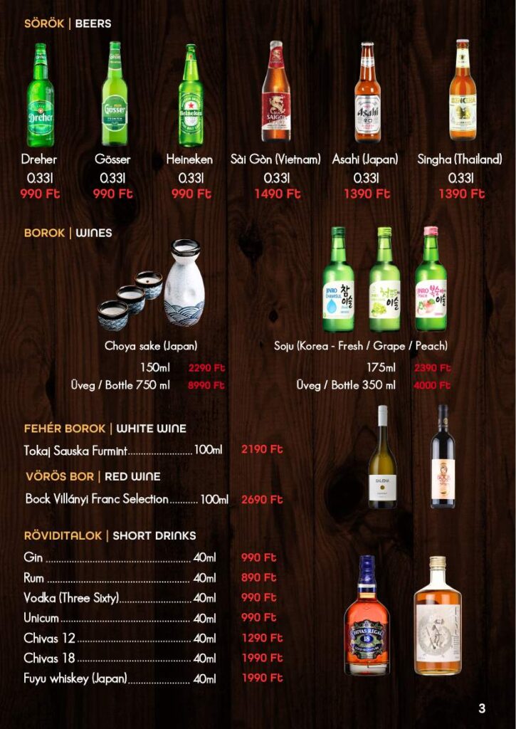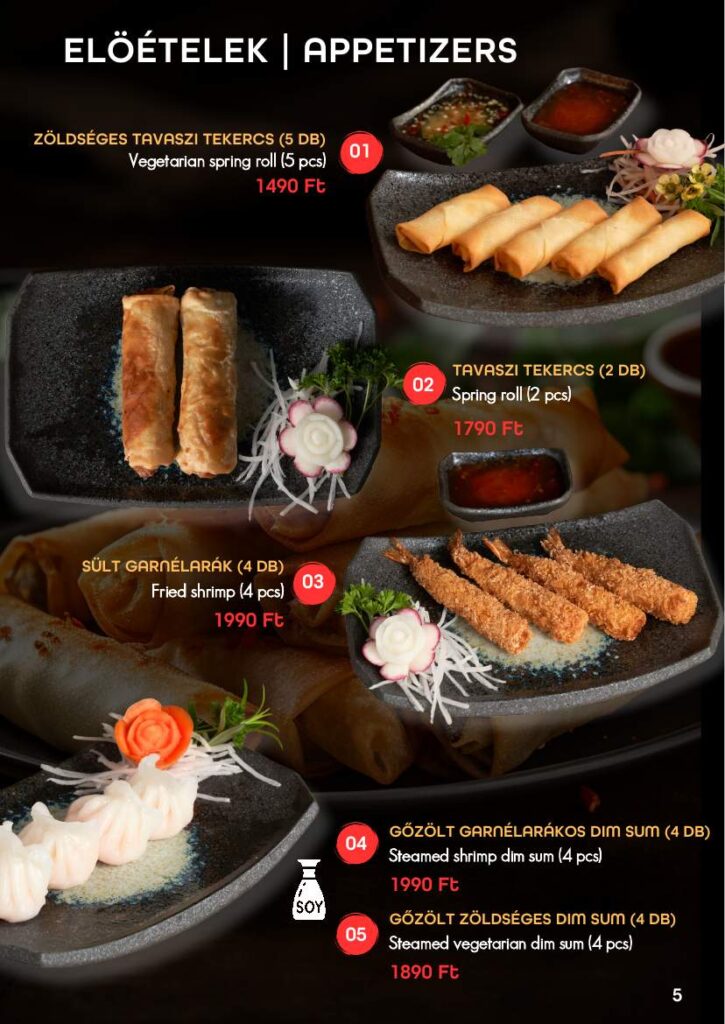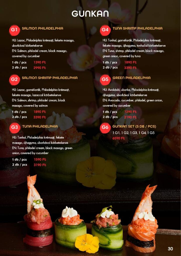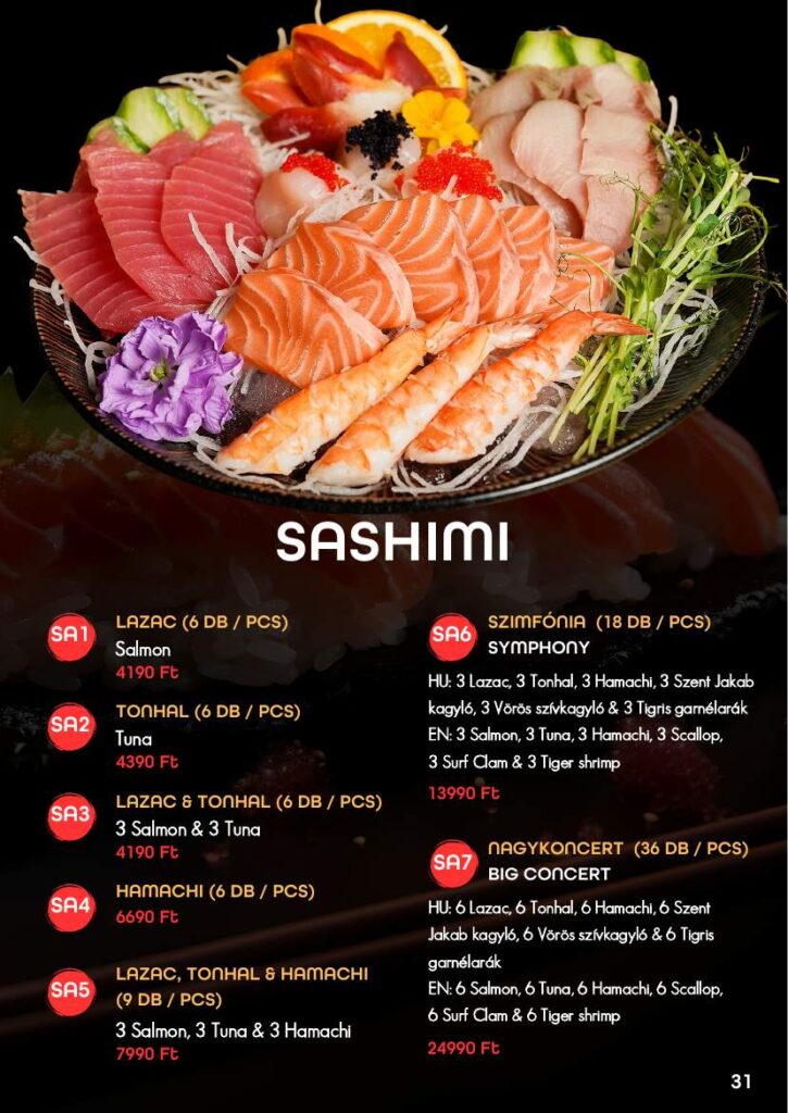 EN:8 salmon maki, 8 tuna maki, 8 shrimp tempura maki, 8 special inside out salmon roll, 8 special inside out tuna roll, 12 fried shrimp tempura roll. 8 nigiri (2 garnélarák, 2 lazac, 2 surimi, 2 tonhall. 8 nigiri (2 shrimp, 2 salmon, 2 surimi, 2 tuna)., 3 lazac és 3 tonhal sashimi, 3 salmon & 3 tuna sashimi.