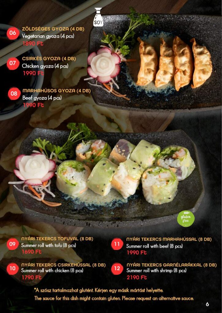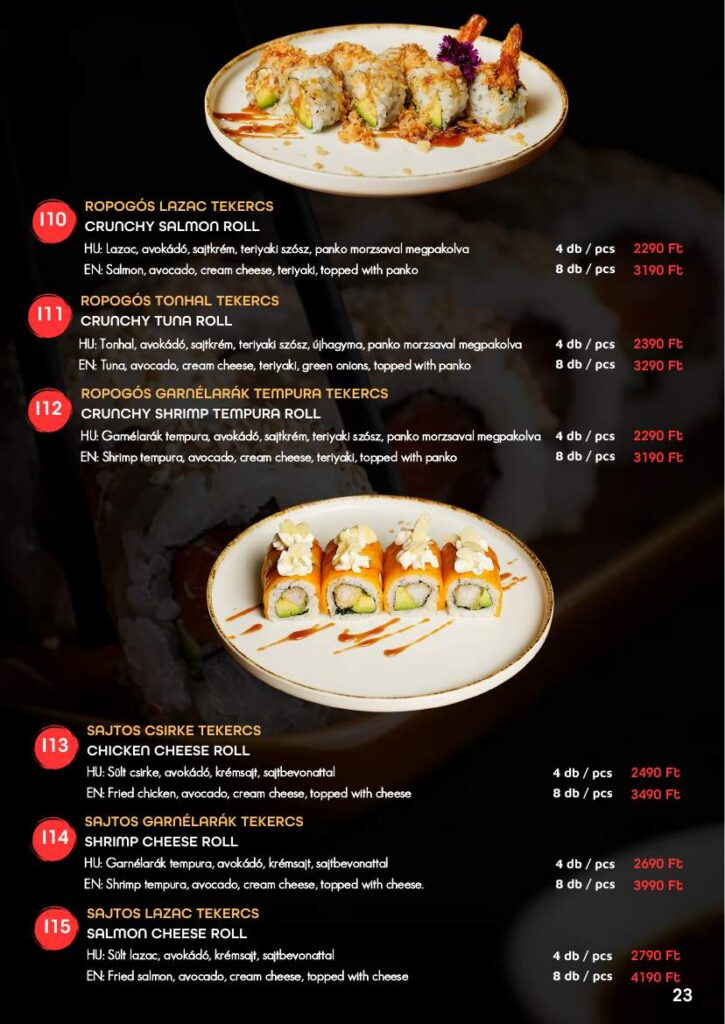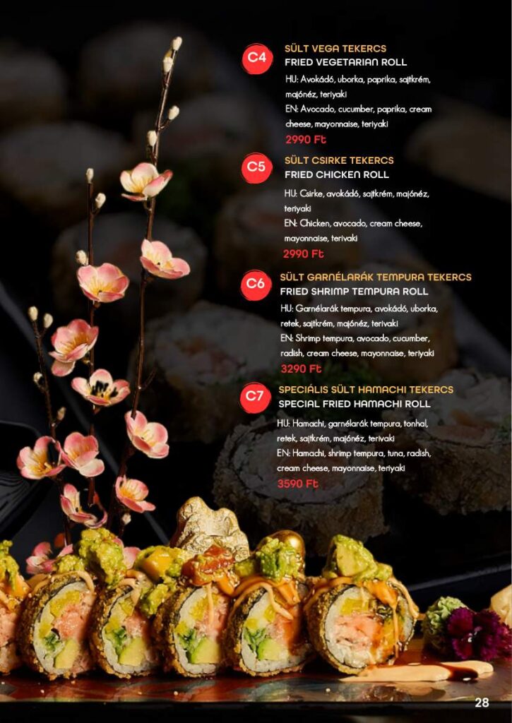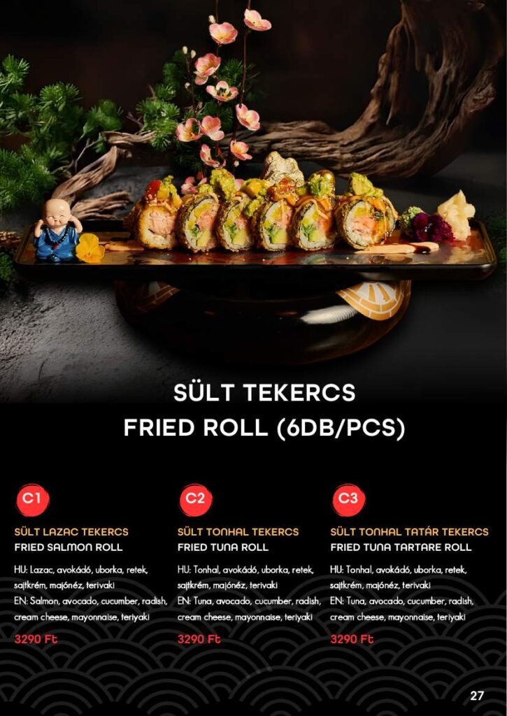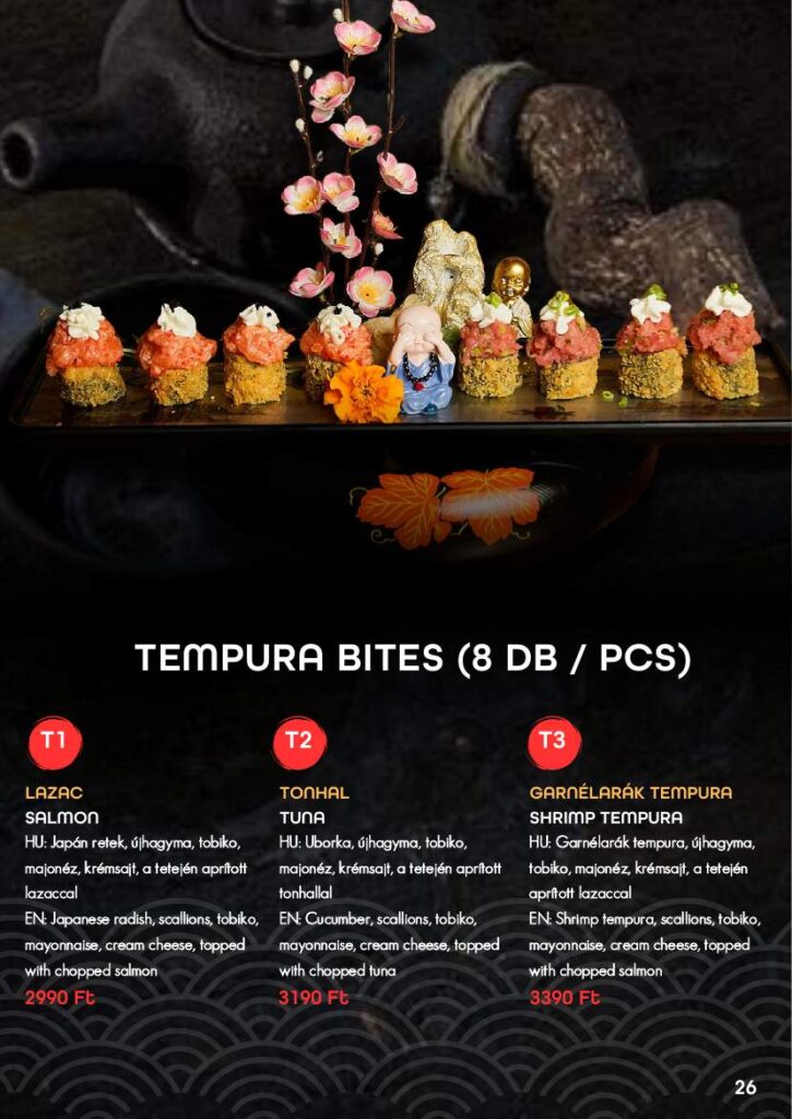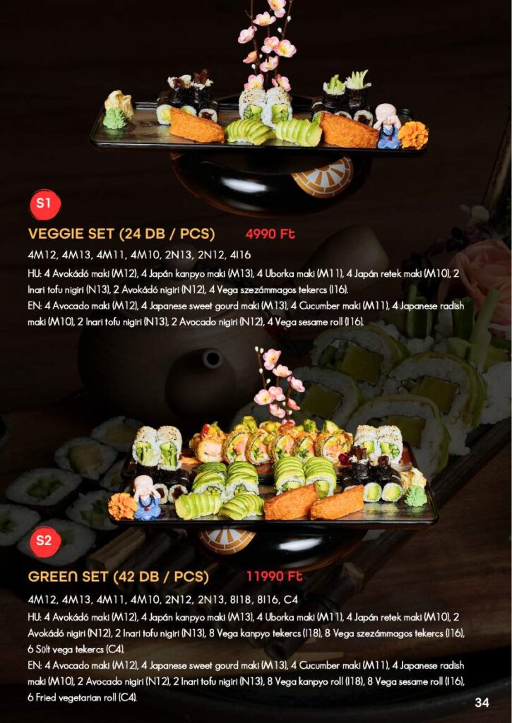 HU: 4 tonhal tatár maki, 4 garnélarák tempura maki, 6 sült vega tekercs, 6 sült lazac tekercs,6 nirigi (2 lazac, 2 tonhal, 2 garnélarák)
