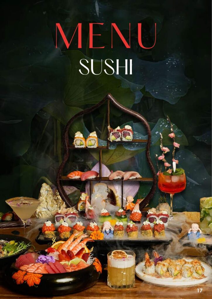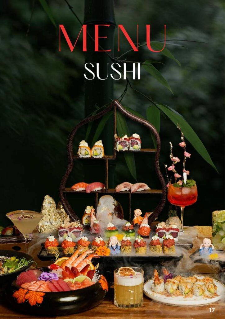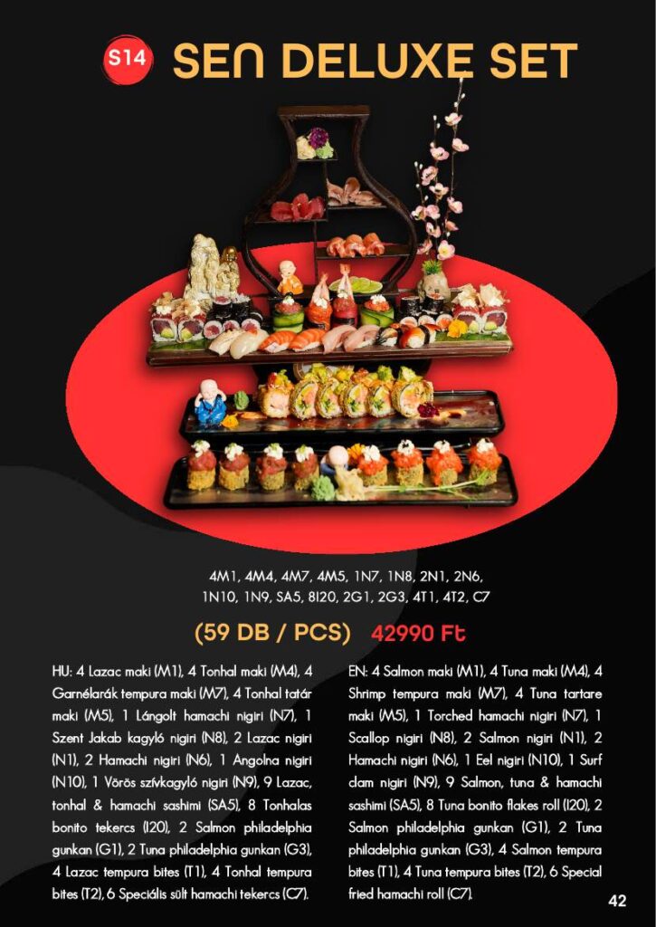 HU: 8 lazac maki, 8 avokádó maki, 8 kifordított lazac tekercs, 4 speciális kifordított lazac tekercs, 4 speciális kifordított tonhal tekercs, 6 sült csirke tekercs, 6 sült lazac tekercs, 6 nirigi (2 lazac,2 tonhal, 2 garnélarák),3 lazac és, 3 tonhal sashimi