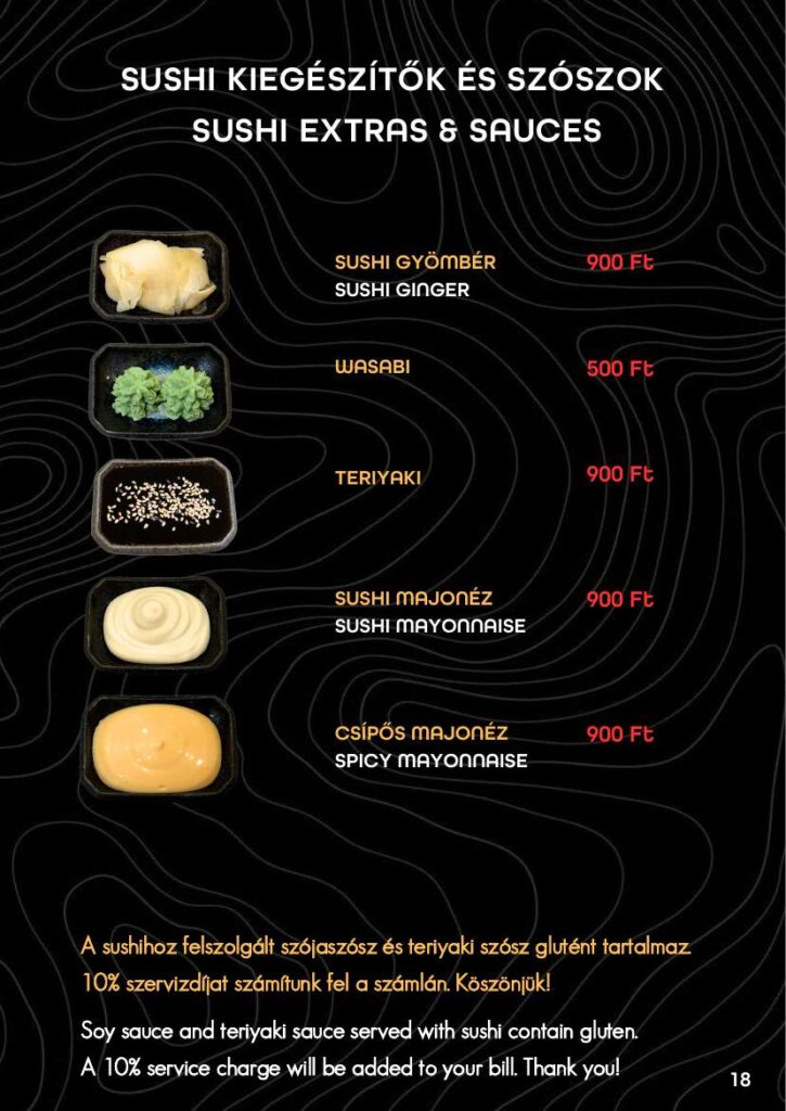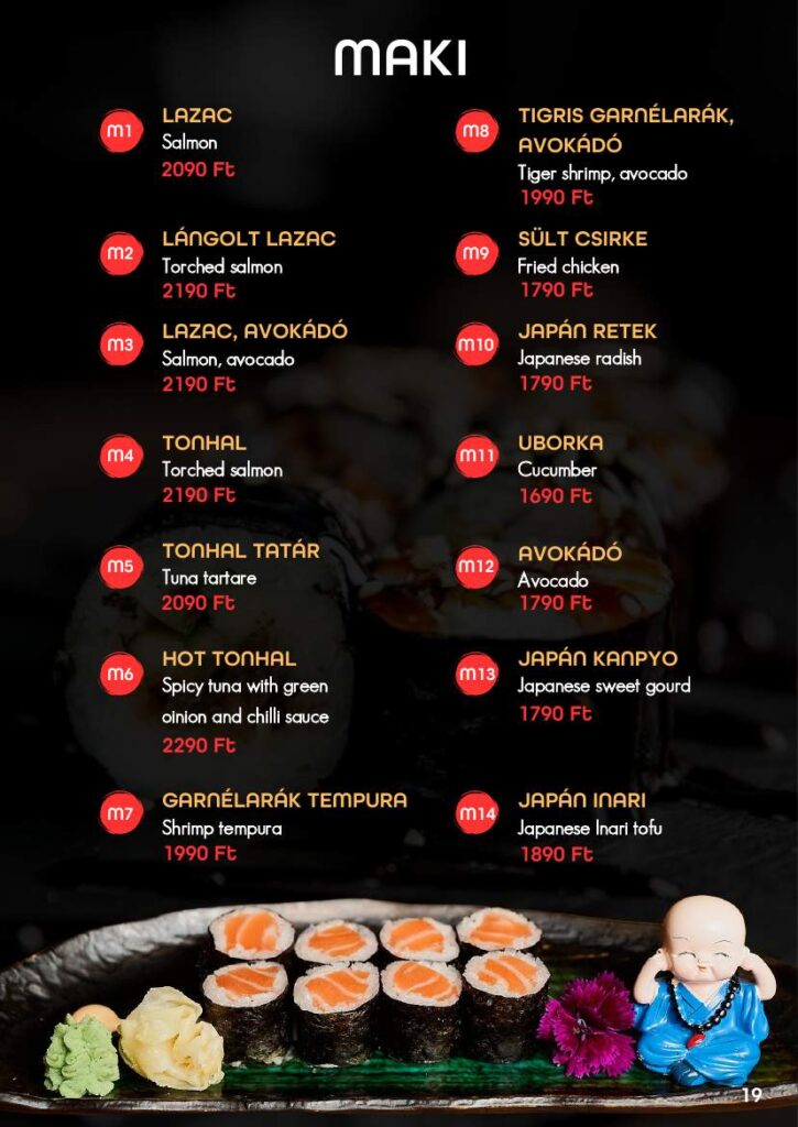 HU: 4 lazac maki, 4 tonhal maki, 4 surimi maki, 4 avokádó maki, 4 uborka maki, 4 garnélarák maki