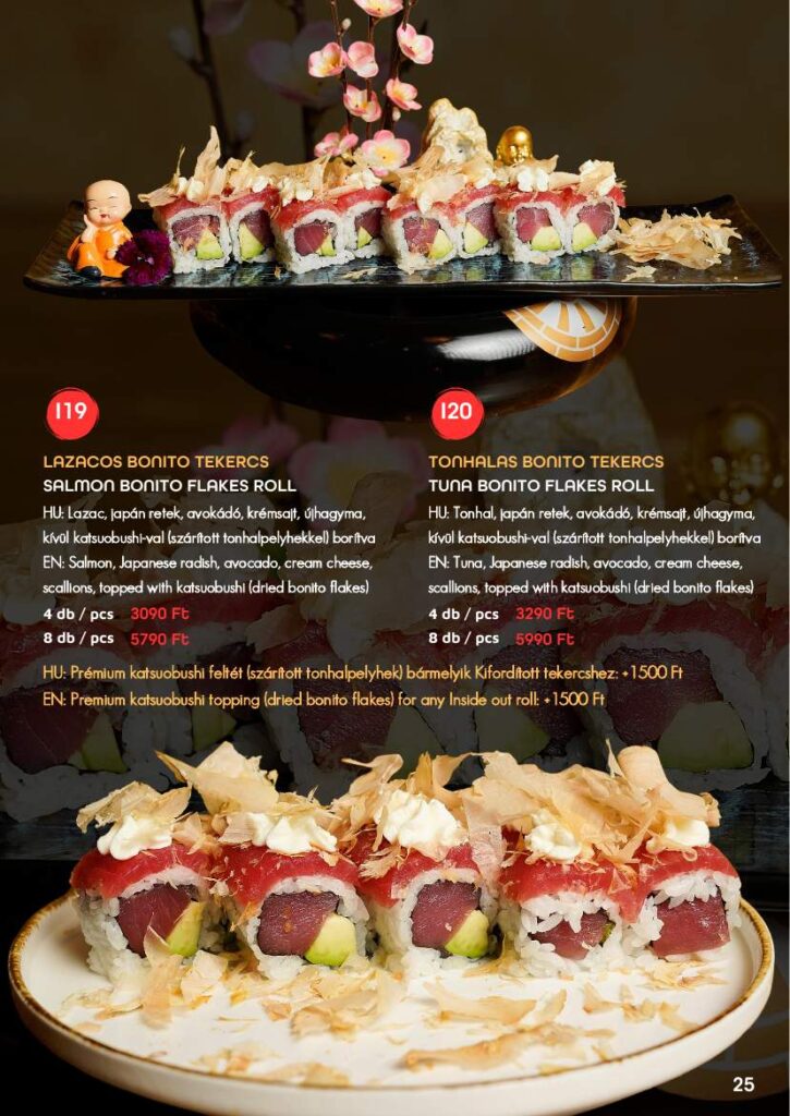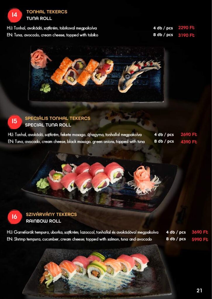 HU: 8 tonhal maki, 8 speciális kifordított tonhal tekercs, 6 sült tonhal tekercs, 2 tonhal nigiri
