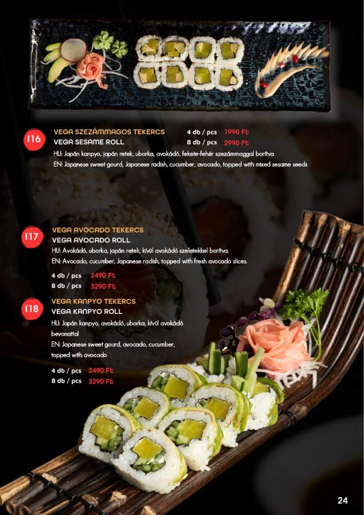 HU: 4 avokádó maki, 4 uborka maki,8 speciális kifordított vega tekercs, 2 avokádó nigiri