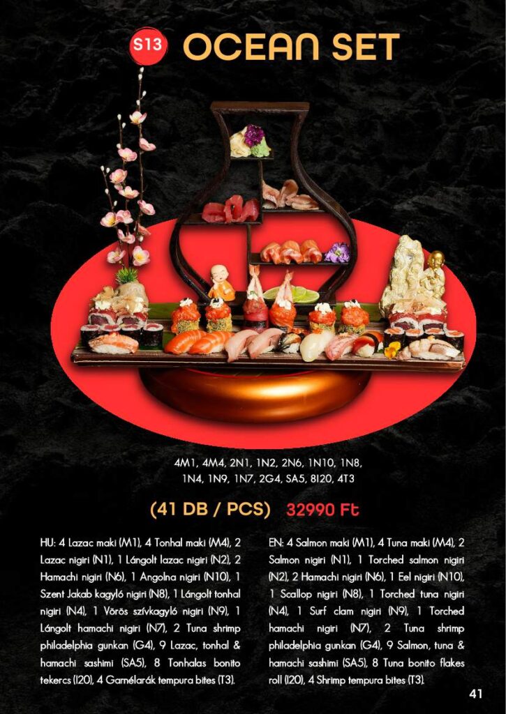 HU: 8 lazac maki, 8 uborka maki, 4 speciális kifordított lazac tekercs, 4 speciális kifordított surimi tekercs,2 tonhal nigiri, 2 garnélarák nigiri, 2 lazac nigiri